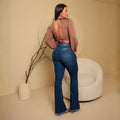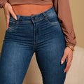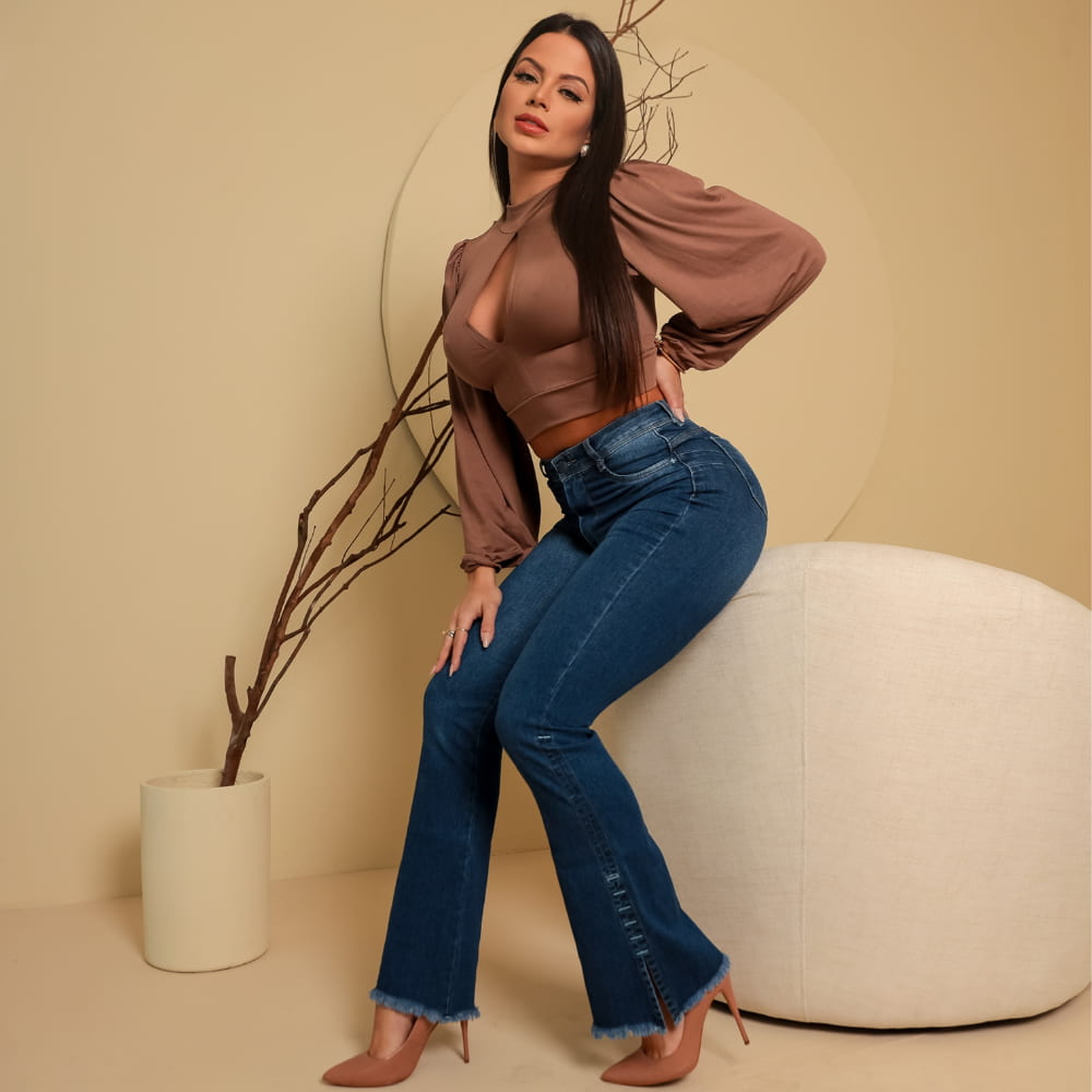 Eleve seu estilo com a Calça Flare Modeladora Azul Escuro, a peça perfeita para quem busca um visual alongado e sofisticado. Com a modelagem flare, que se ajusta ao corpo até o joelho e abre sutilmente na barra, esta calça jeans de cós médio é ideal para criar looks elegantes e modernos. A composição com 3% de elastano e a tecnologia LYCRA® garantem uma elevada elasticidade e um caimento que empina o bumbum, valorizando a silhueta com máximo conforto e liberdade de movimento. Esta calça flare é a escolha certa para quem não abre mão de estilo e bem-estar no dia a dia.